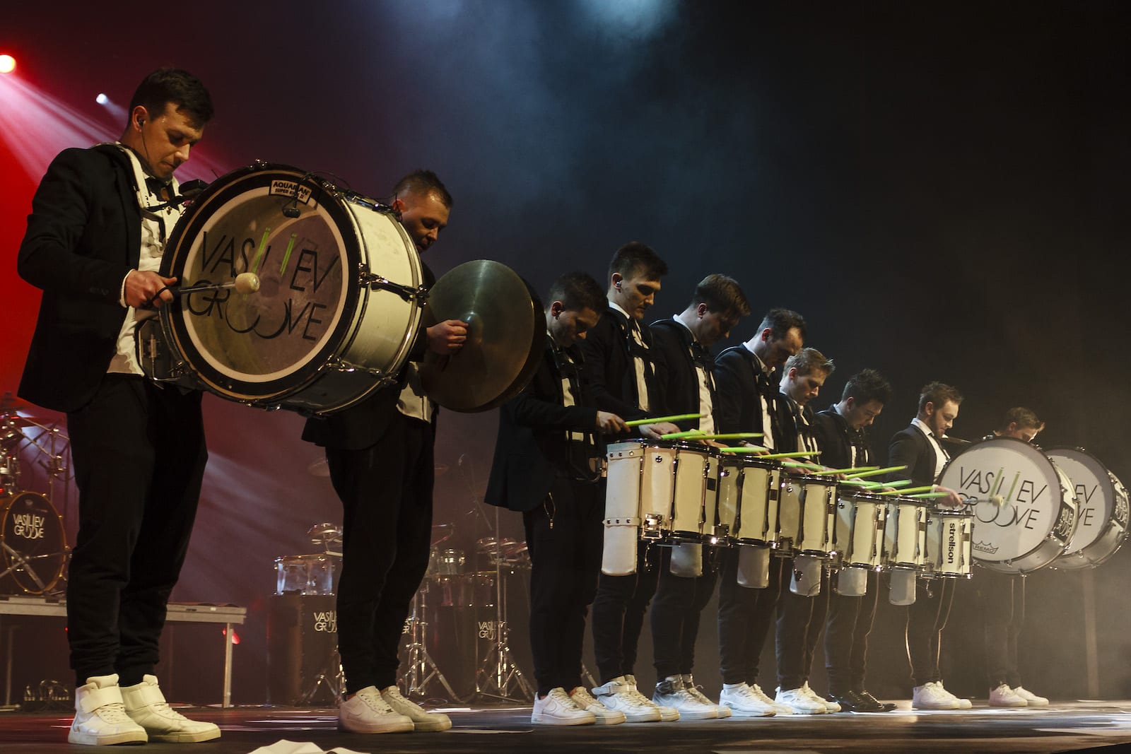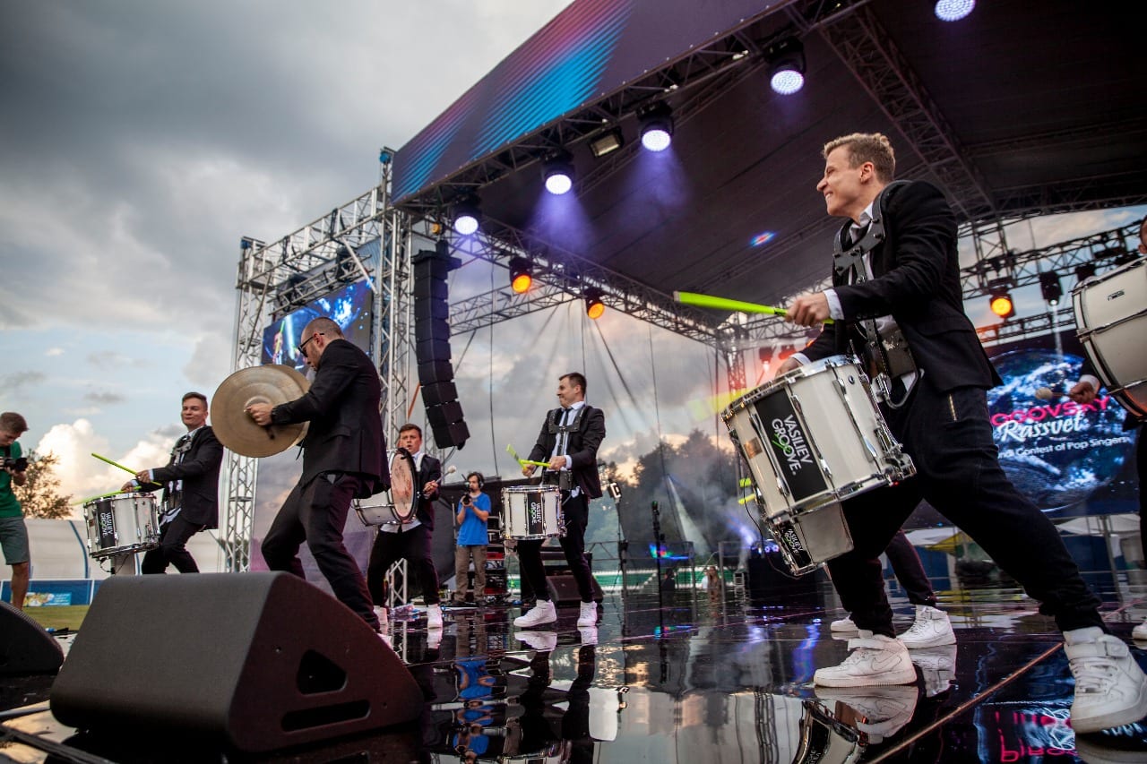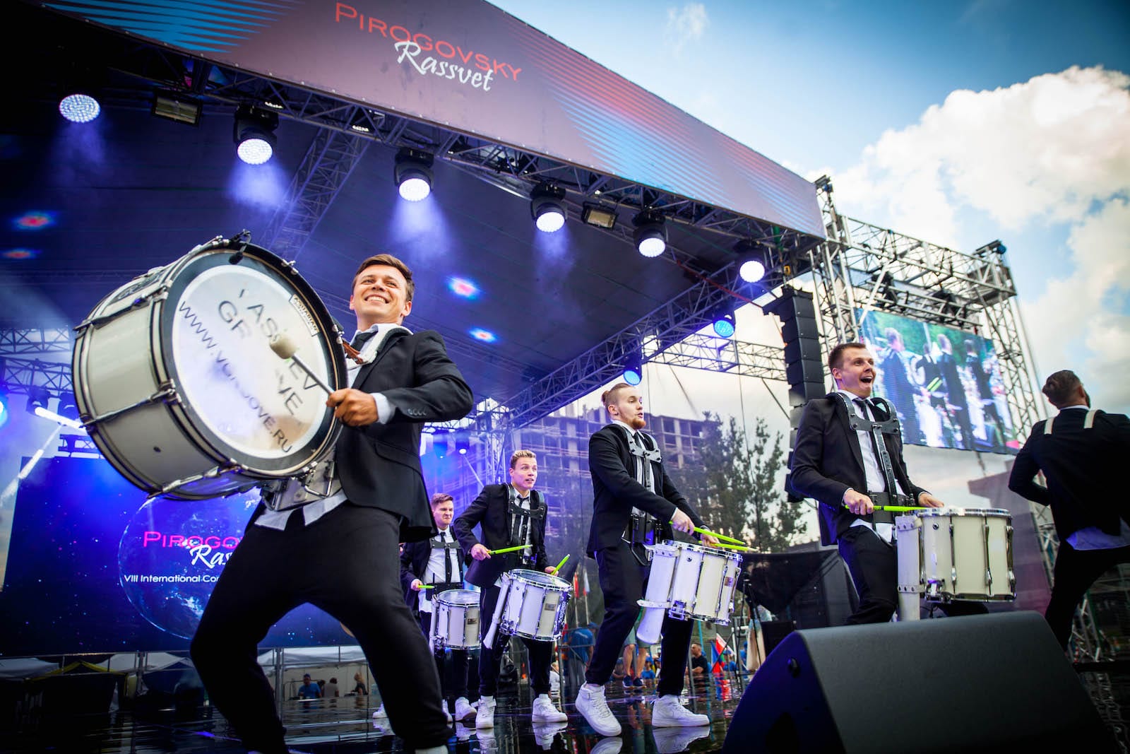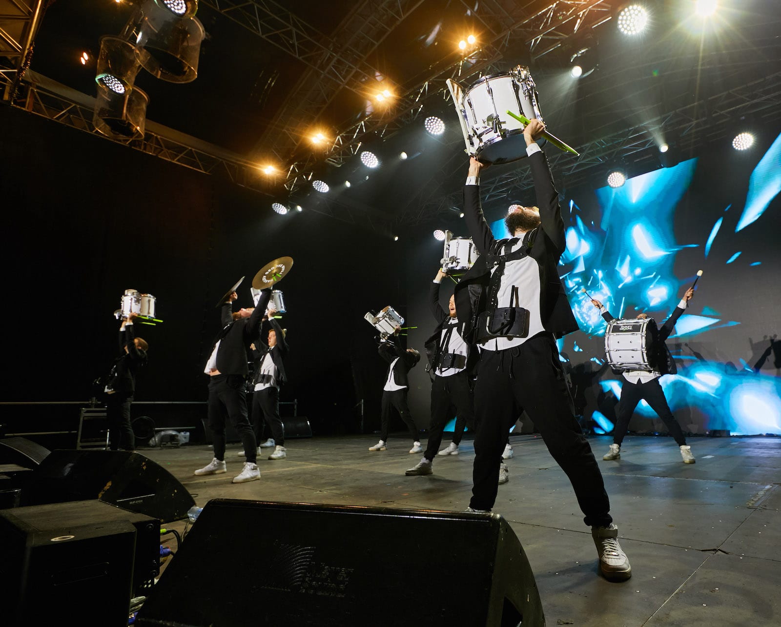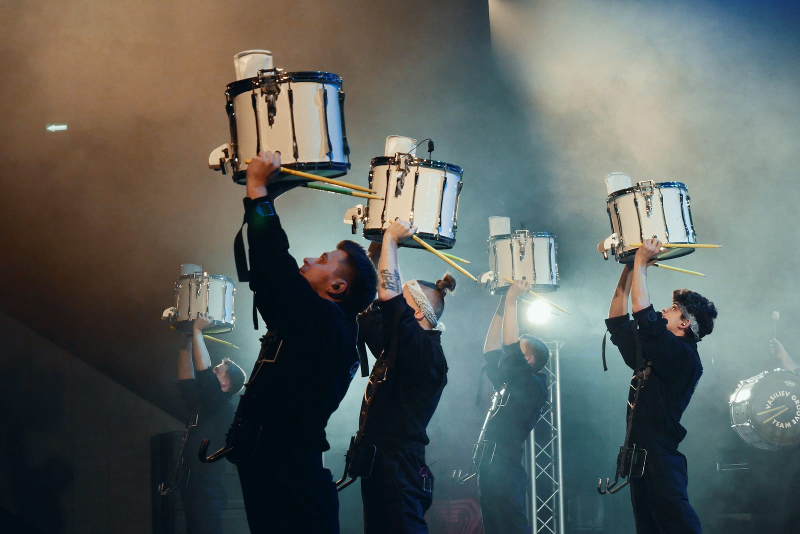 Динамичный номер на маршевых барабанах с визуальными эффектами.