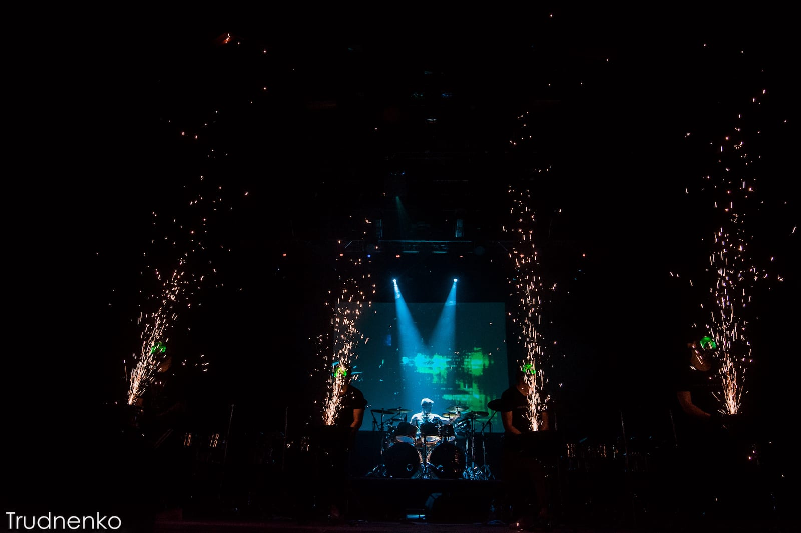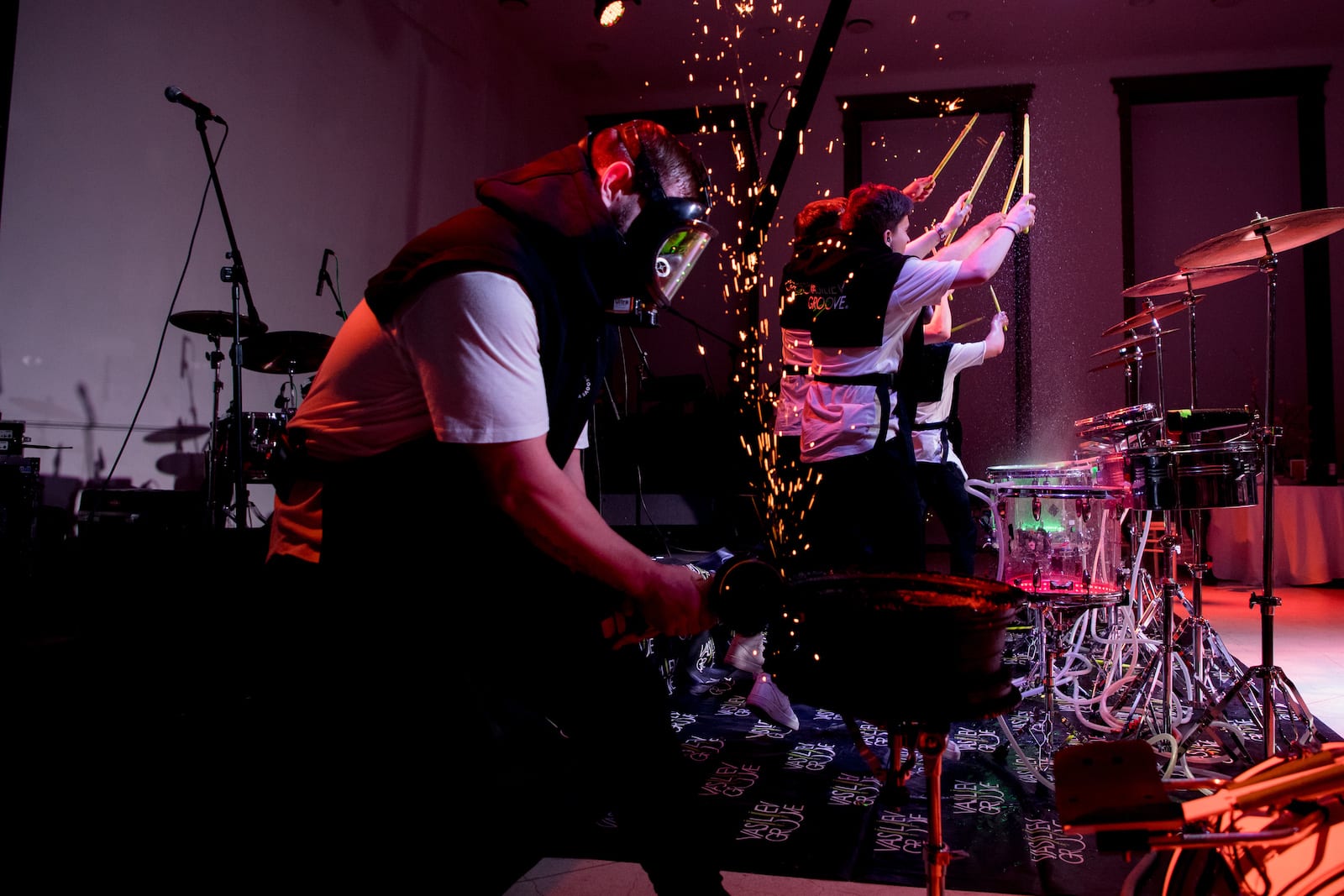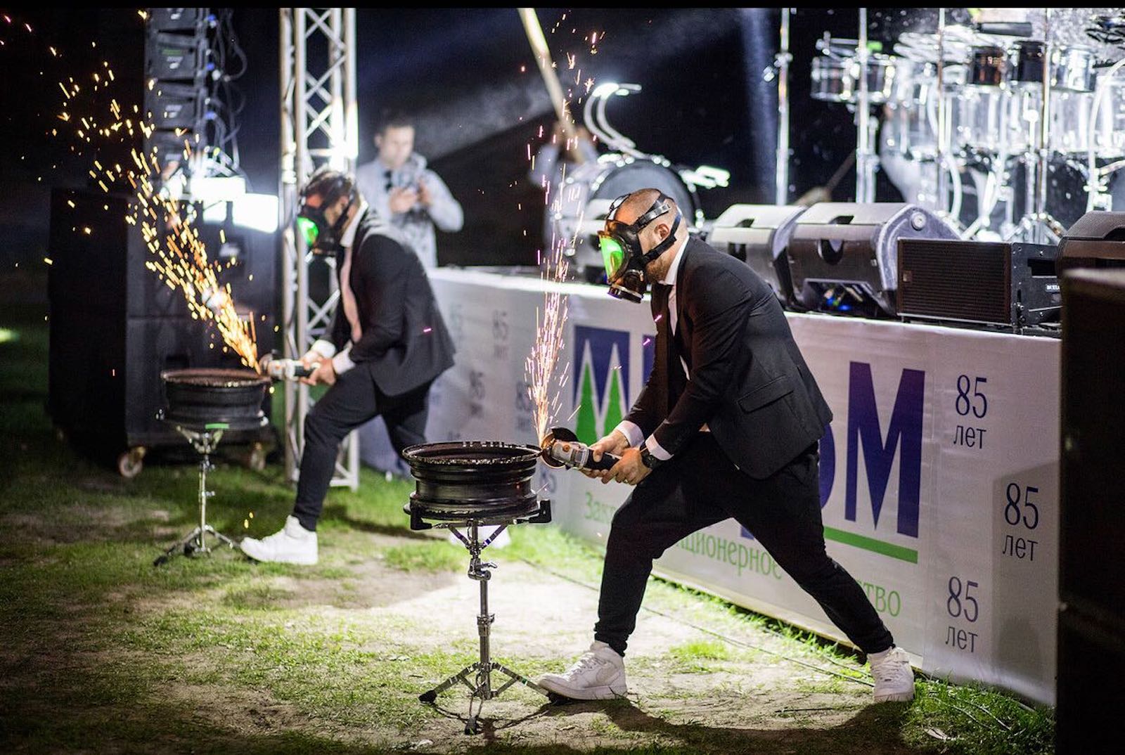 Динамичный номер с игрой на акустической установке, холодными искрами от болгарок и музыкантами.