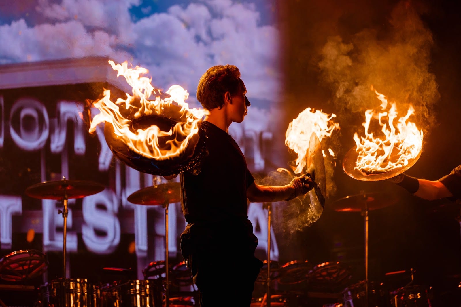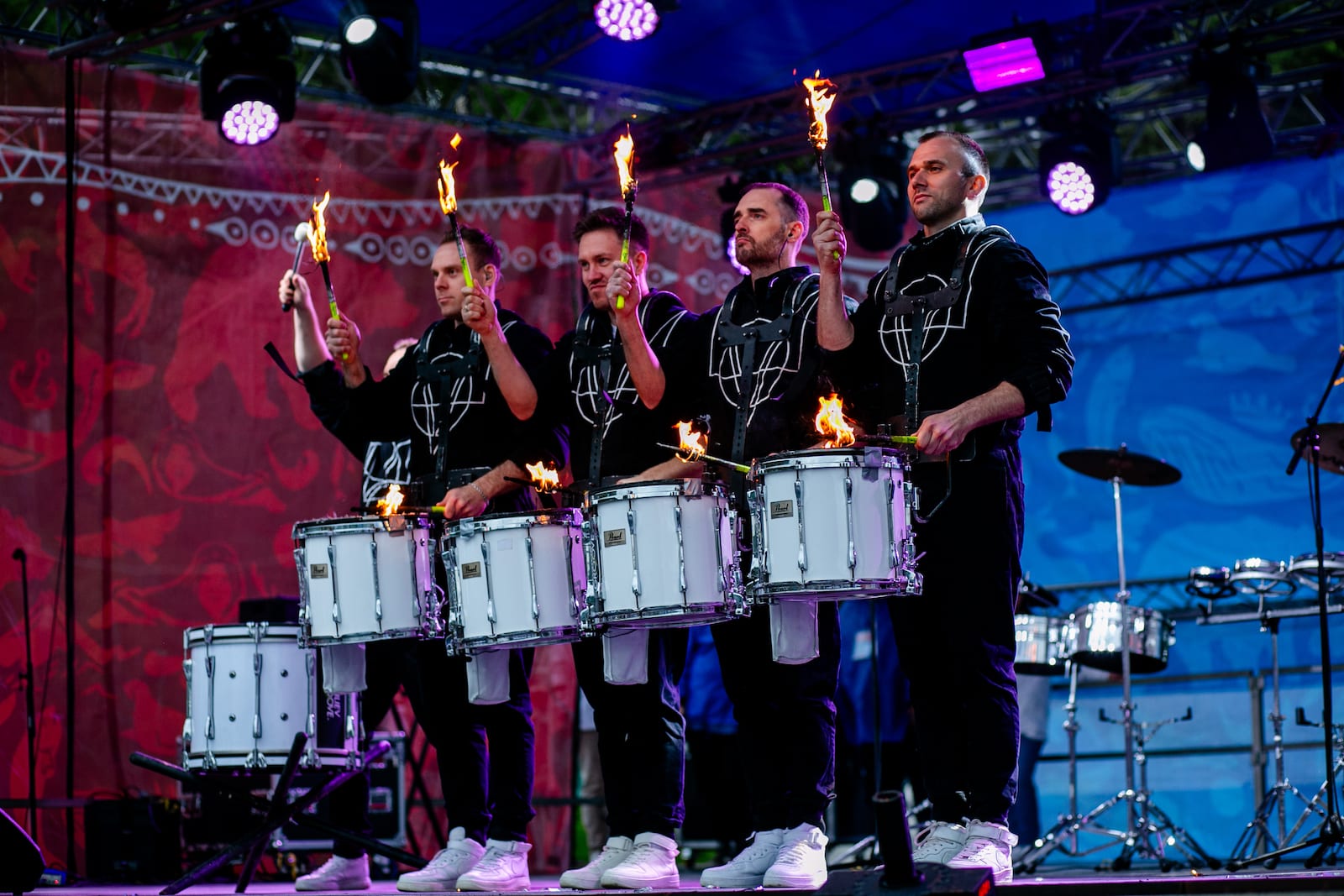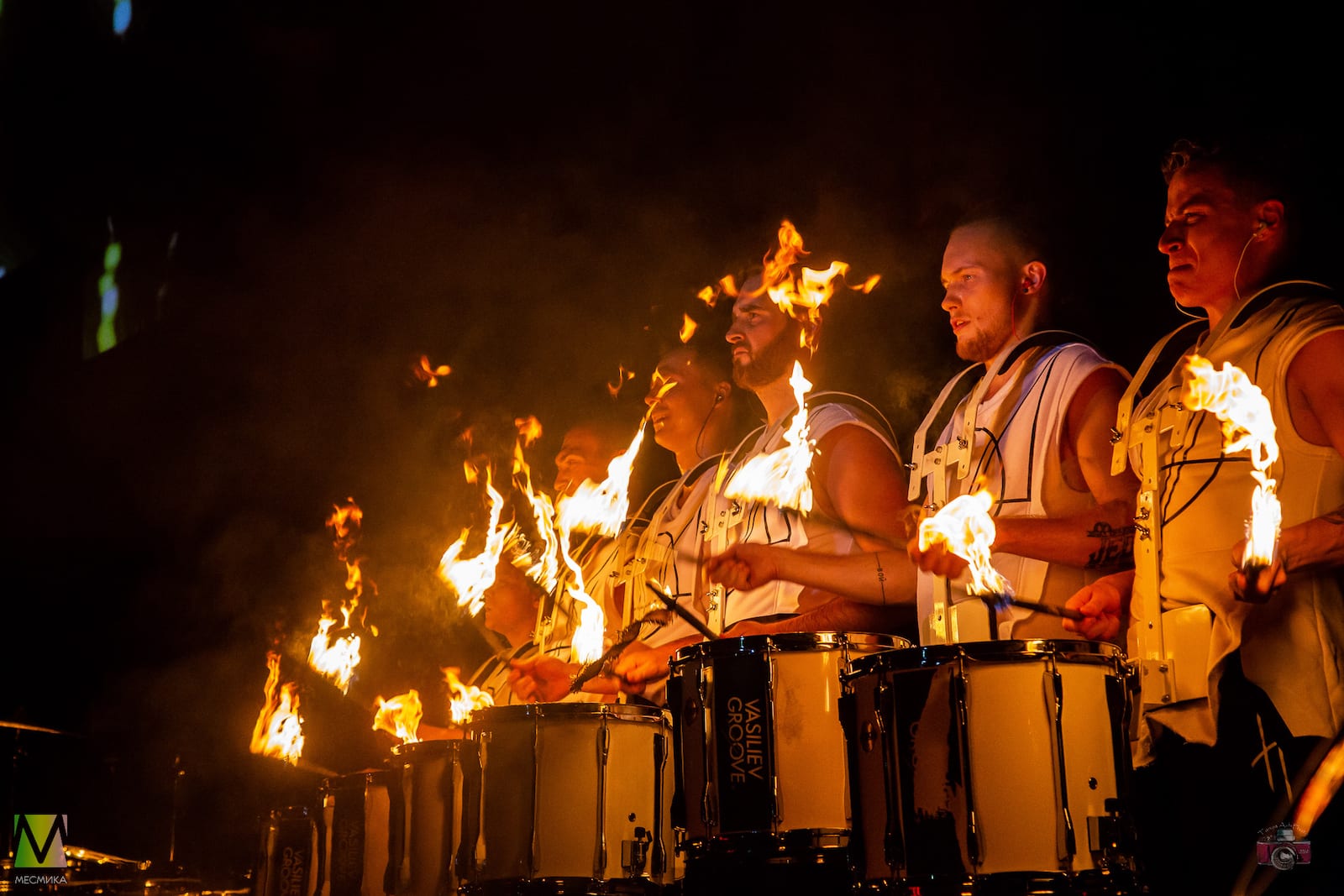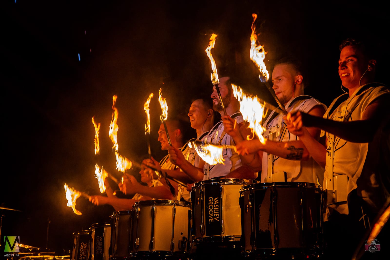 Номер исполняется на маршевых барабанах огненными палками.