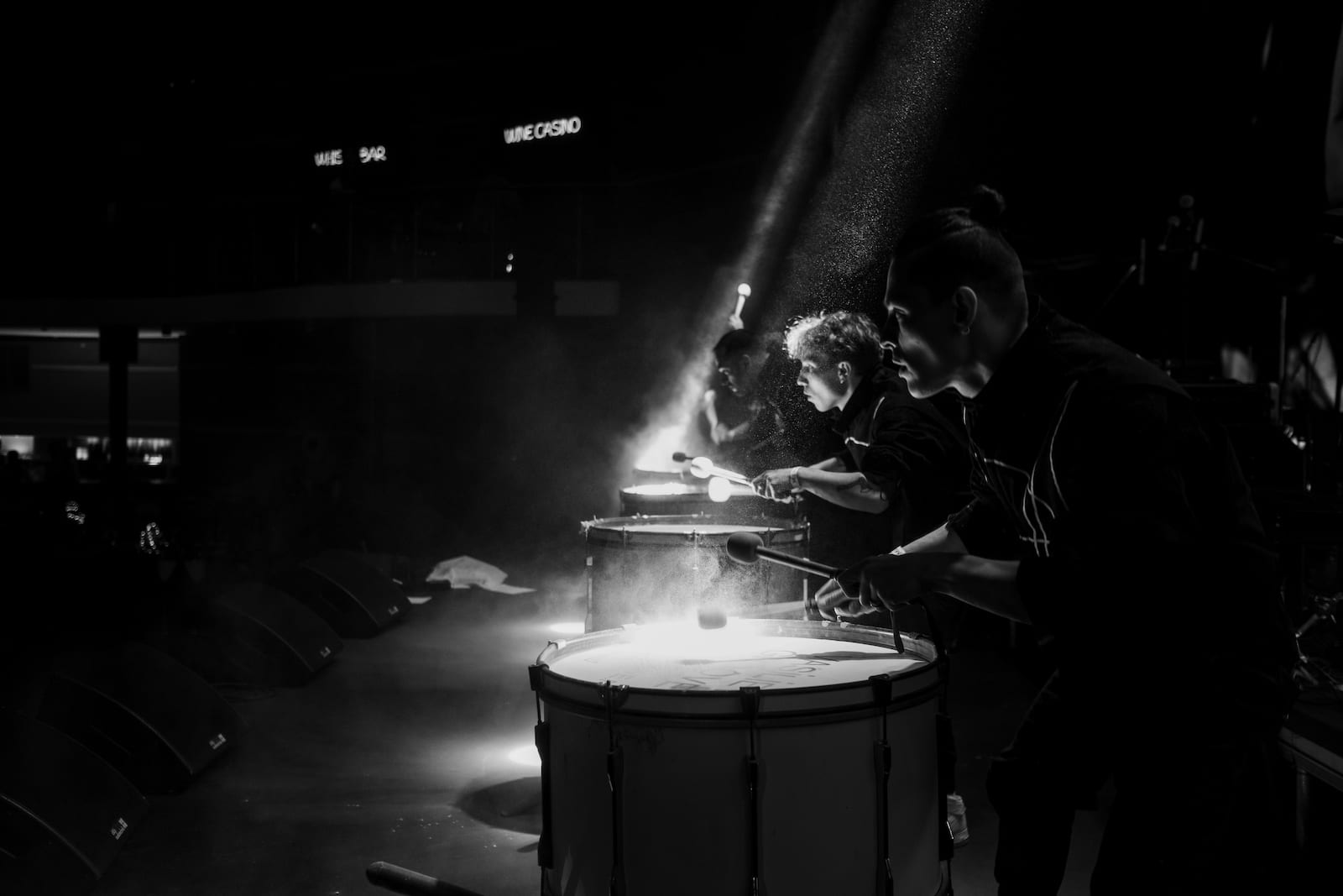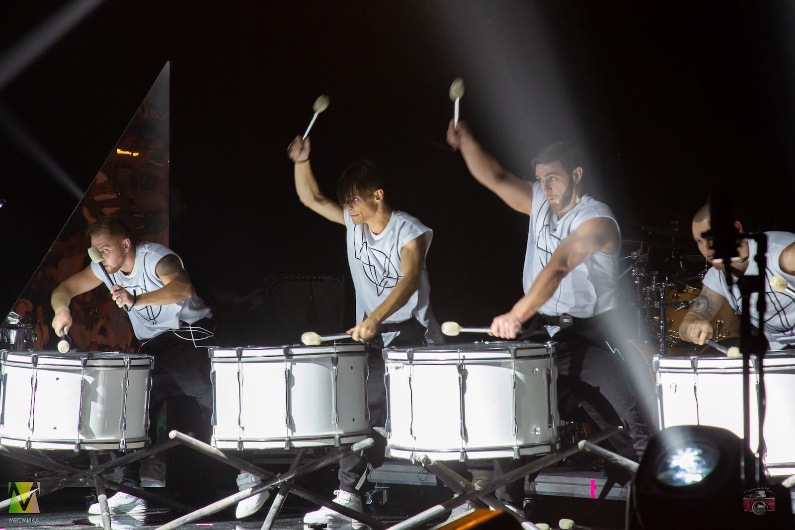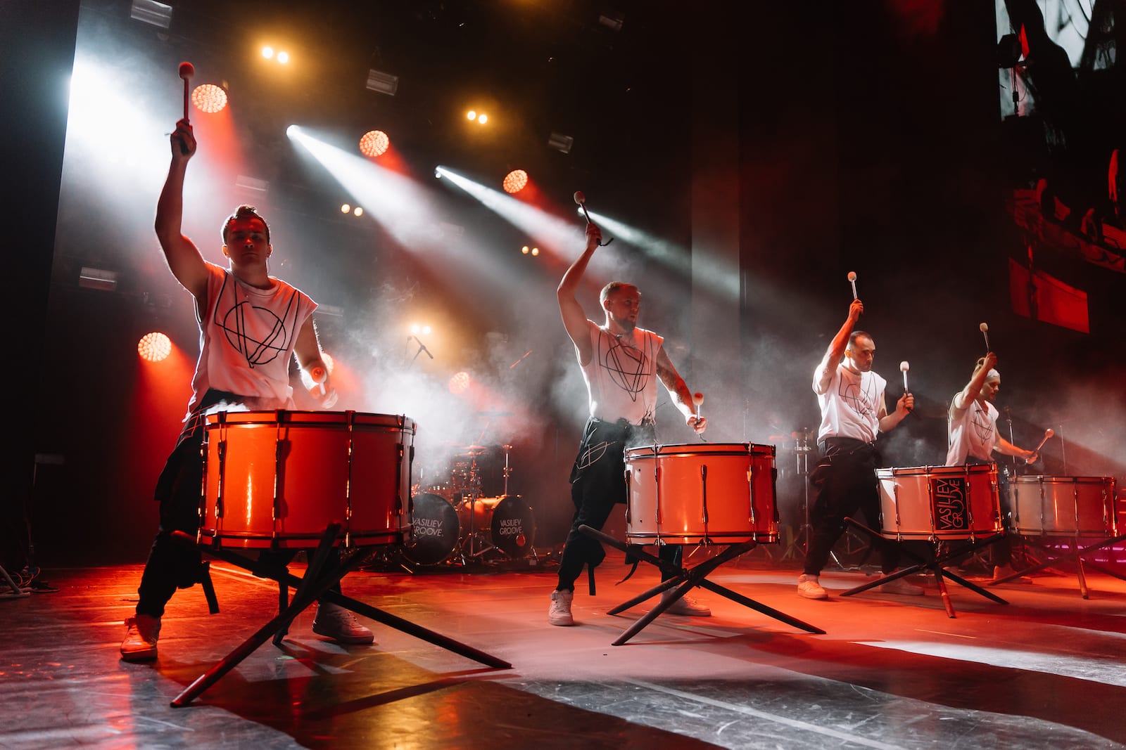 Номер исполняется на больших барабанах, установленных на крестах или металлических бочках.